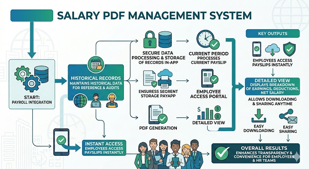 Displays detailed breakdown of earnings, deductions, and net salary.